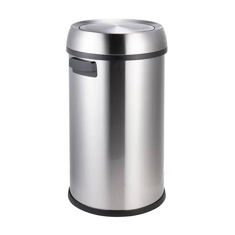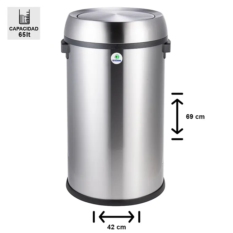 Se presenta este basurero de 65 litros con tapa giratoria, elaborado en acero inoxidable que combina resistencia y estética. Es una excelente opción para espacios amplios, aportando practicidad y un diseño moderno al entorno.