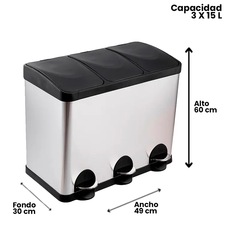 - Dimensiones: 49 cm de alto, 60 cm de ancho, 30 cm de profundidad; capacidad total de 3 × 15 litros.