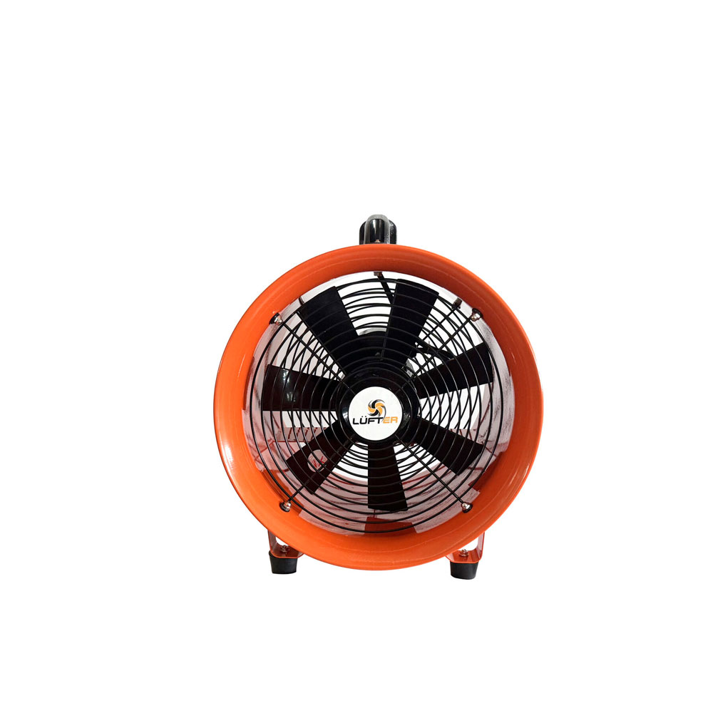 Este extractor portátil cuenta con un cuerpo metálico cilíndrico en color naranja de alta visibilidad, rejillas protectoras delanteras y traseras, y una asa ergonómica que facilita su transporte. Sus patas con base antideslizante aseguran estabilidad durante su funcionamiento, incluso en superficies irregulares.
